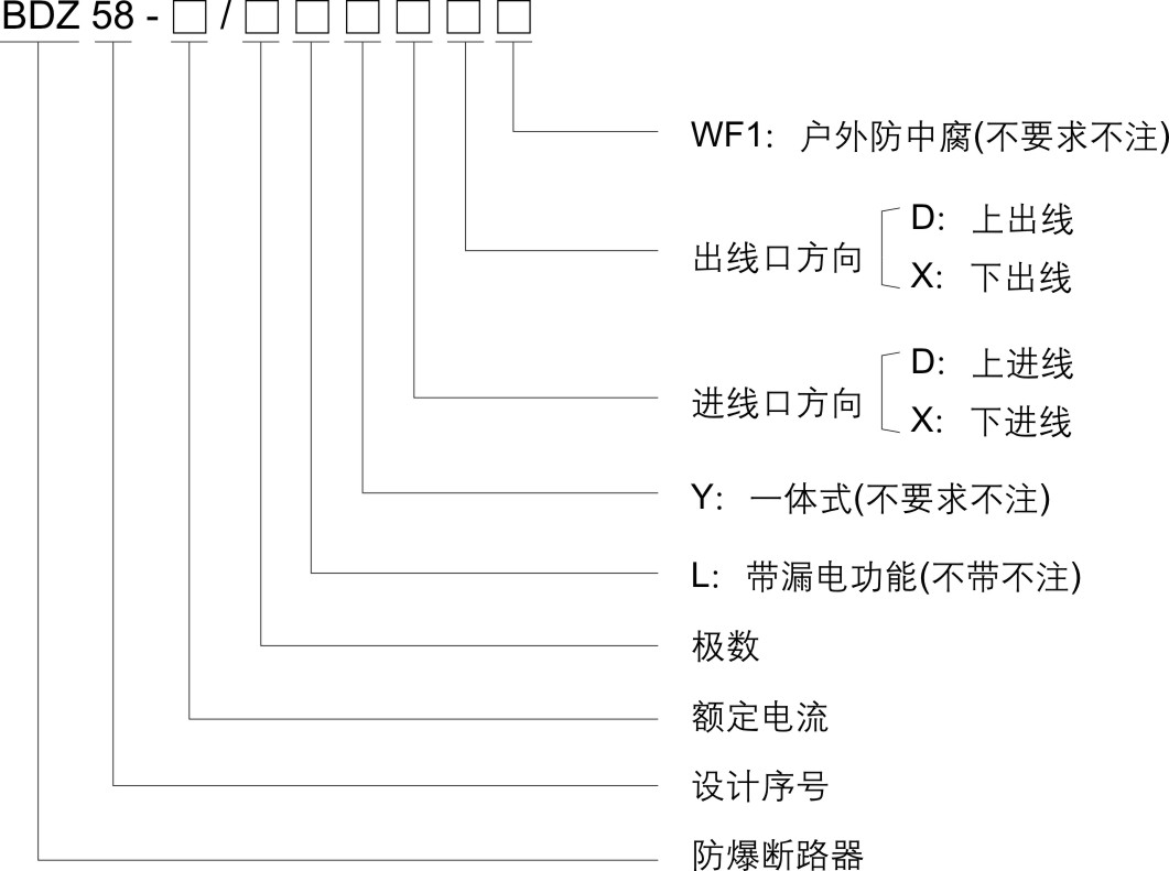 > 例如:需要 10A、3 級、下進下出,則產品型號為 BDZ58-10/3XX。