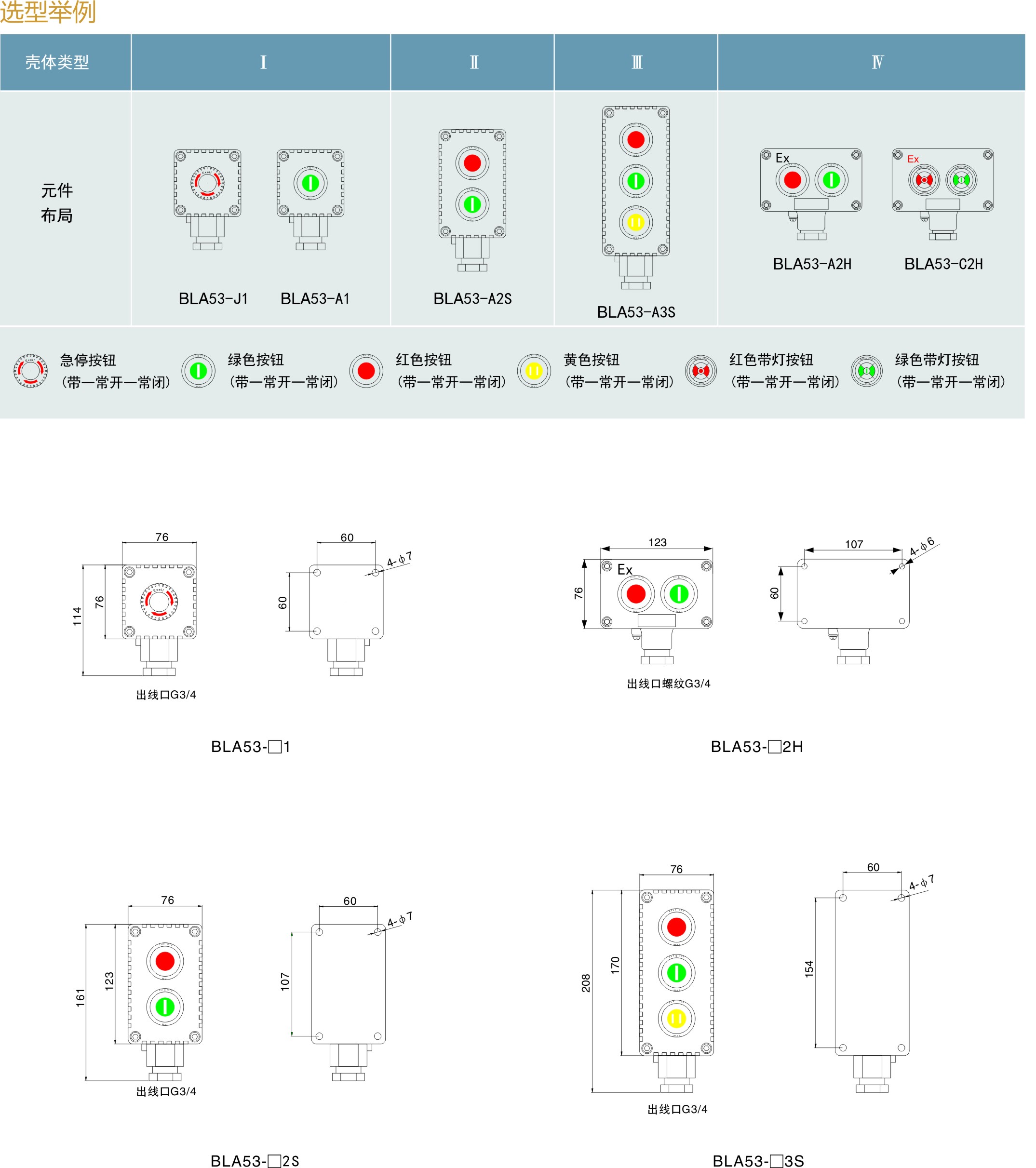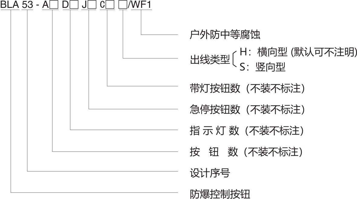 > 例如:需要 防爆控制按鈕 帶1個紅色按鈕、1個綠按鈕和1個黃色按鈕,則產品型號規格為:BLA53-A3S。
